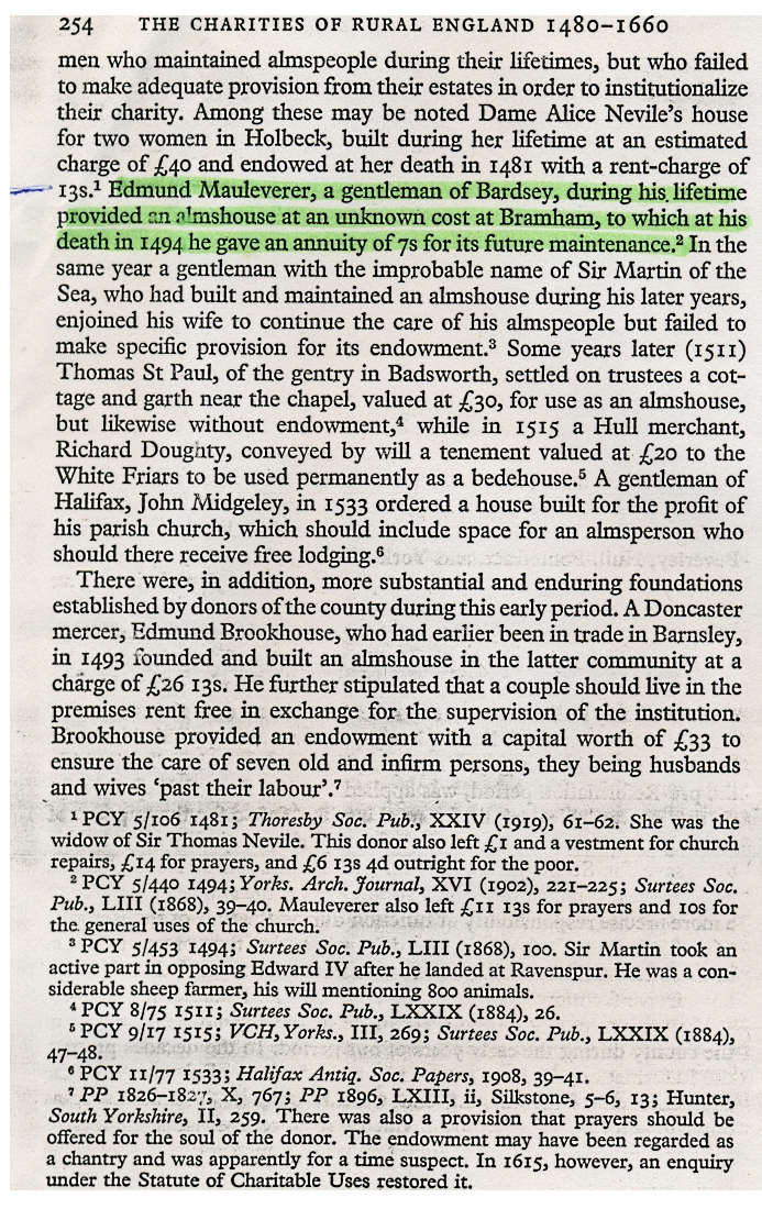 3. A page giving information on various people, including Edmund Mauleverer, who donated various almshouses in the years between 1480 and 1660.