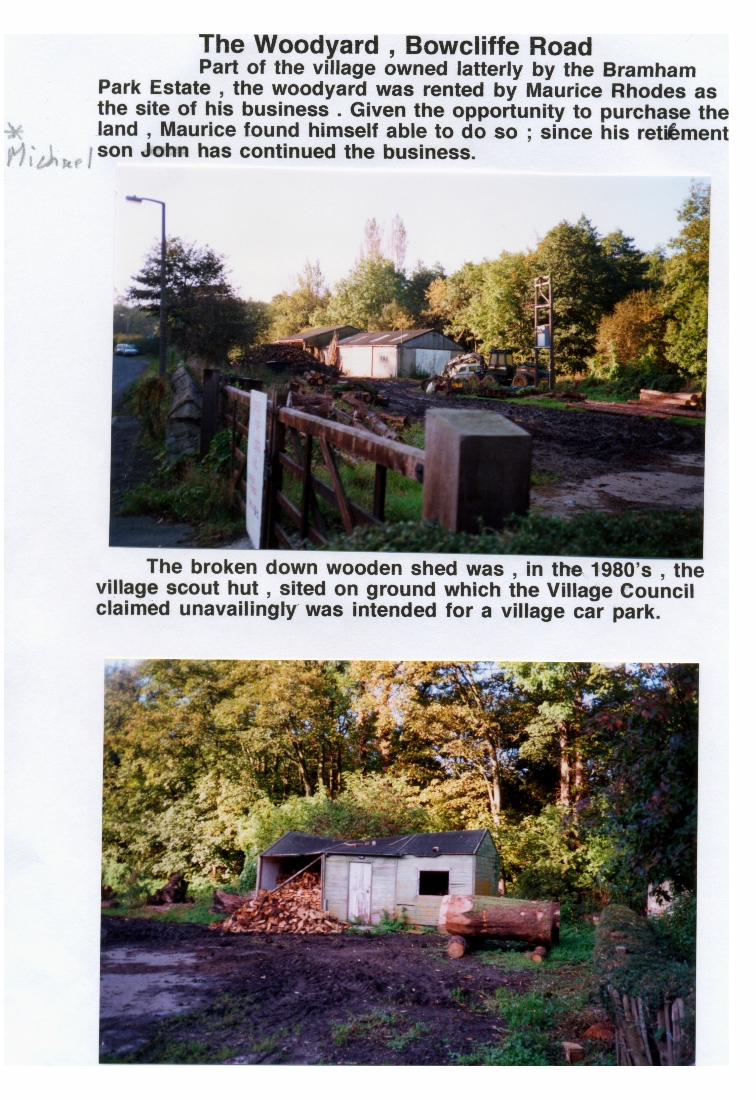 1. Two photos dated about 2000 : a) The Woodyard situated on the west side of Bowcliffe Road on land purchased by Maurice Rhodes from Bramham Park Estate and b) The northern end of the yard, near the wall of the Old People's Shelter, showing the old shed that was formerly the scout hut.