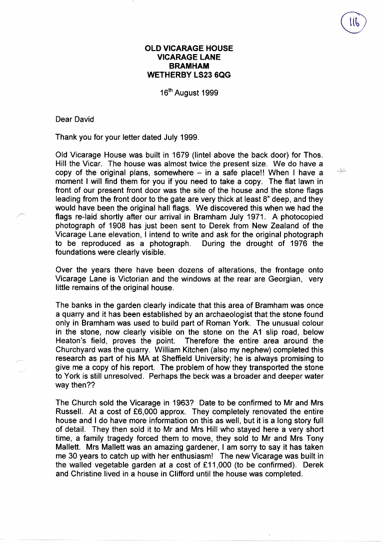 13. & 14. A letter dated 1999 from Anne Palmer, resident in The Old Vicarage, giving details of the history of the building.