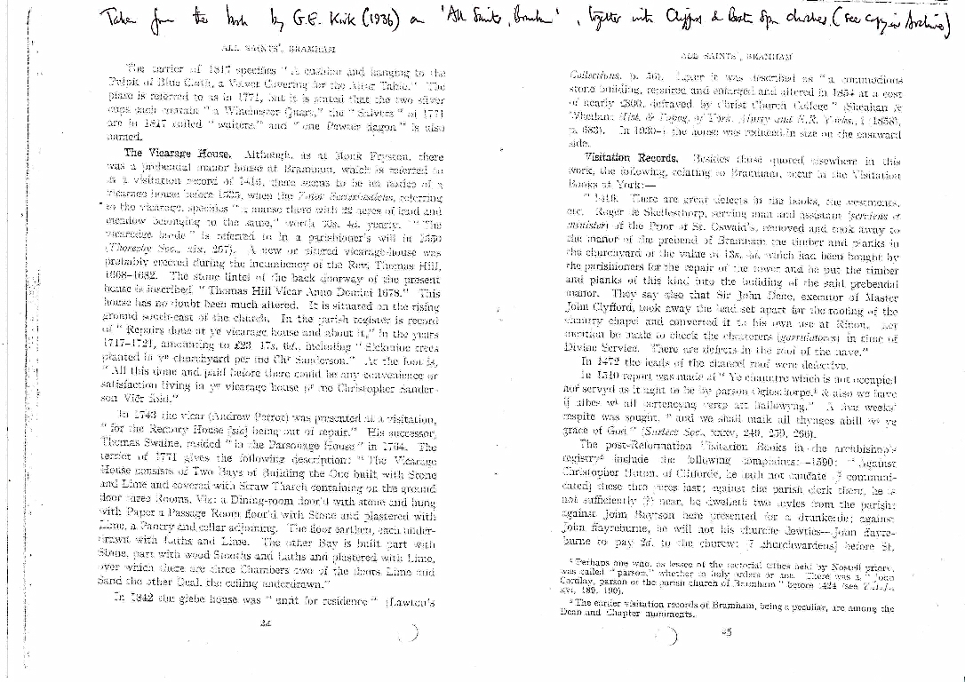 15. A copy of two pages of the book by G.E. Kirk (1936) on All Saints Bramham with information on the church valuables in 1771, details of 'The Vicarage House' from 1416 to 1931 and 'Visitation Records' covering the period 1416 to 1590.