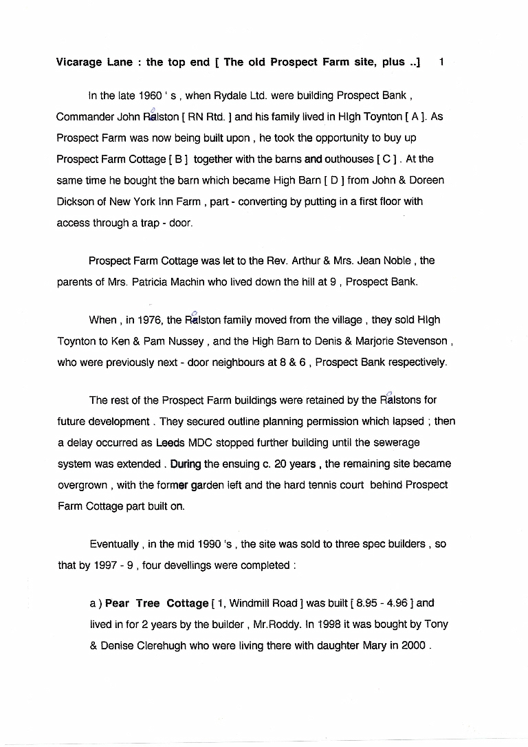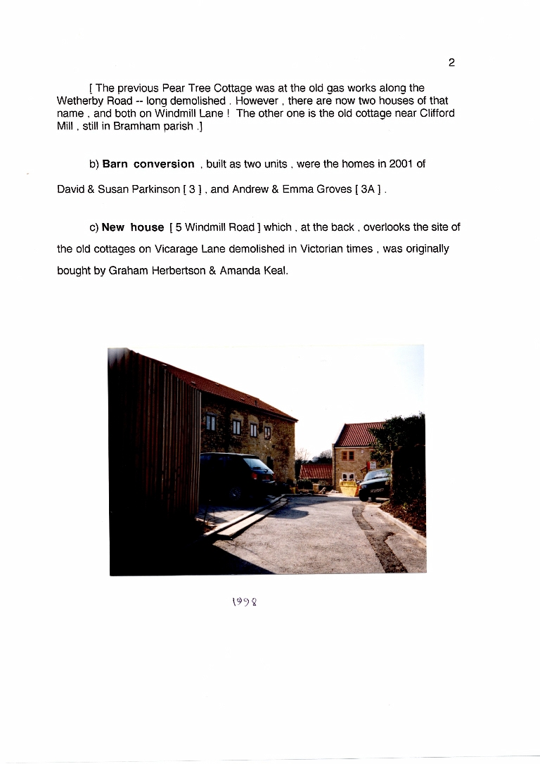 1. & 2. Describes the development of properties on land formerly occupied by farm buildings belonging to Prospect Farm at the upper end of Vicarage Lane during the second half of the 20th century. A photo on page 2 dated 1998 shows the Barn Conversion and the new No.5 Windmill Road.