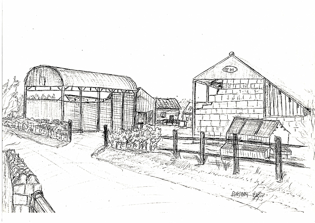 3. A sketch of the Prospect Farm buildings on Windmill Road. The Dutch barn on the right probably straddled the boundary fence between 7 Windmill Road and 1 Prospect Bank.