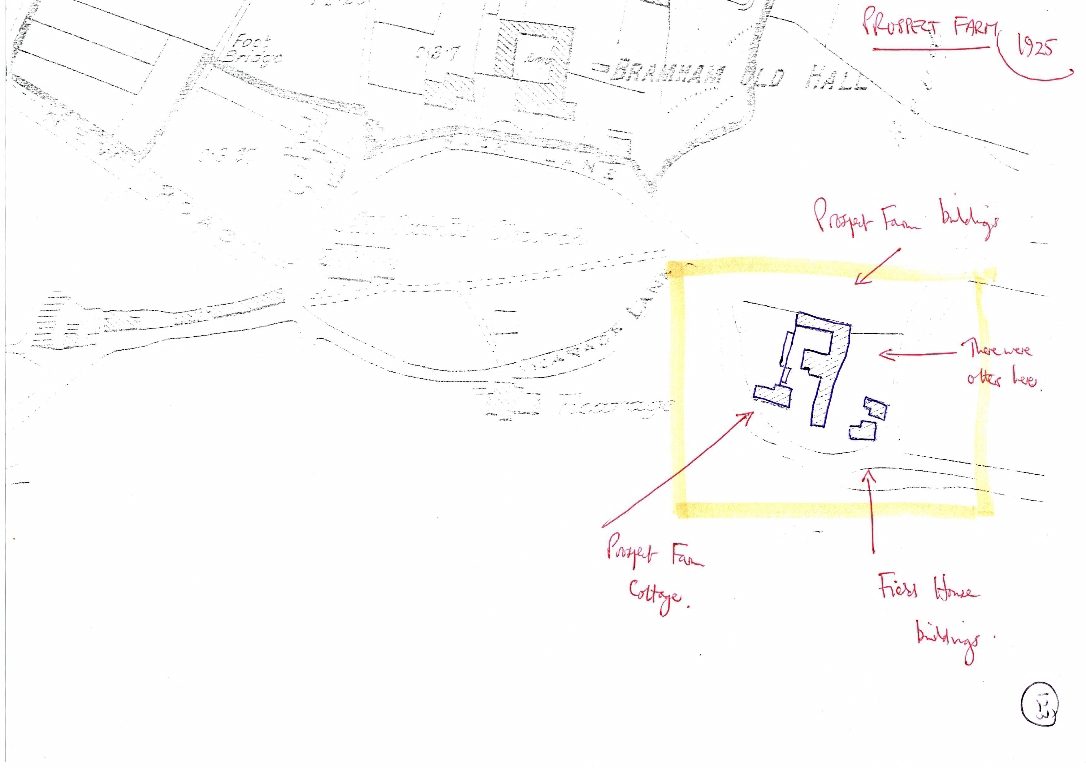 6. A rather faint sketch of the churchyard, Back Lane and Vicarage Lane showing the locations of Prospect Farm Cottage, Prospect Farm buildings and Field House buildings.