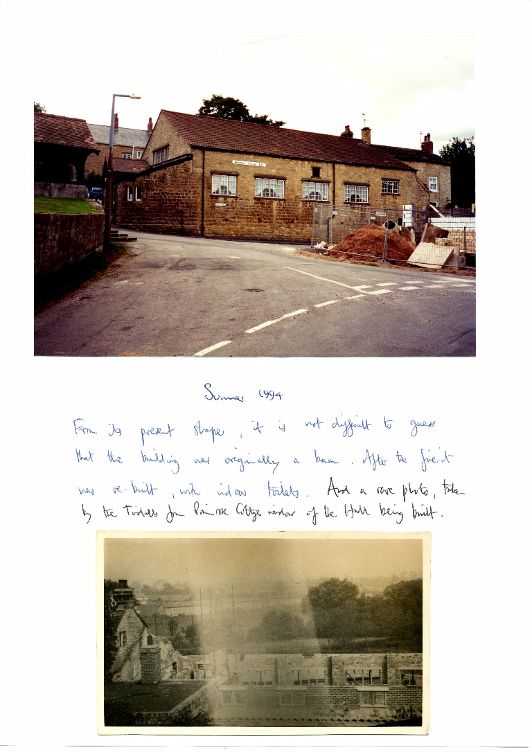1. Two photos. The first shows the hall in the summer of 1994 and the second was taken from the window of Primrose cottage during the hall's construction as a conversion from the original barn.
