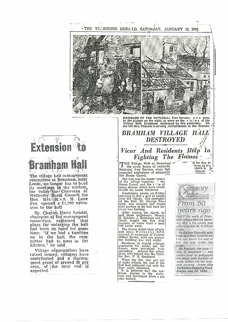 2. A press cutting from the Yorkshire Herald dated 15th January 1944 describing the destruction of the Village Hall by fire on the previous day - only the outer walls were left standing.